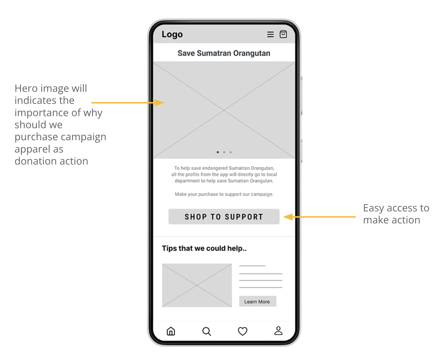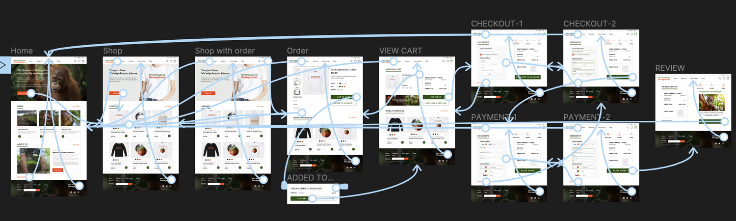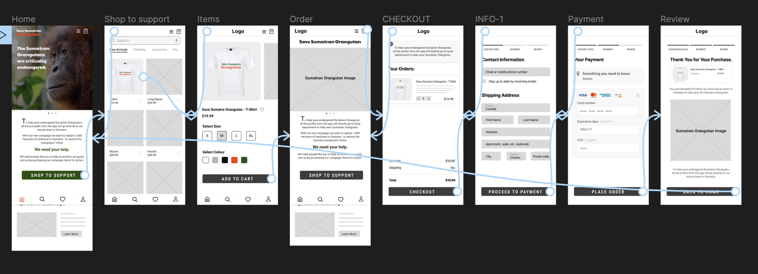Low-Fidelity Prototype   To prepare for usability testing, I created a low-fidelity prototype that connected the user flow of purchasing an item to help make contribution to the campaign.  View   Save Sumatran Orangutans’ low-fidelity prototype